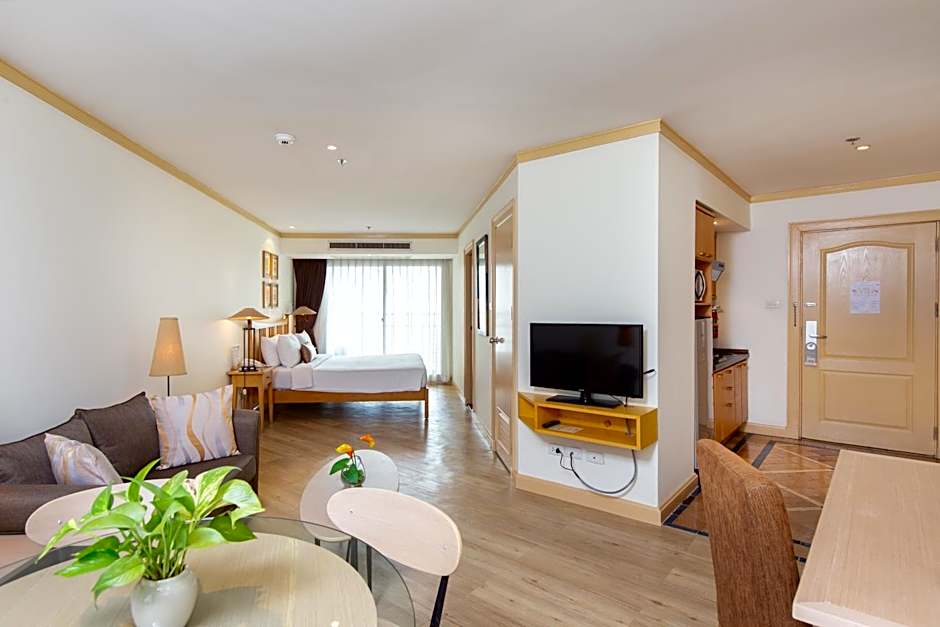 Suite offers a seating area with sofa, a kitchenette and a dining area. A private balcony and an private bathroom are included.